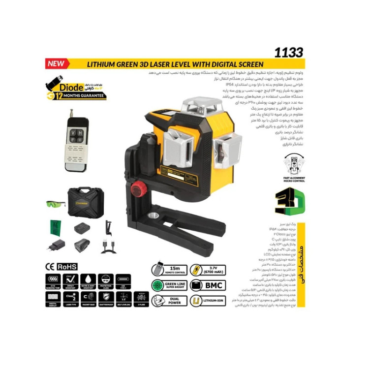 | سایر توضیحات | ارای قابلیت خود ترازی 3.5± درجه دارای درجه حفاظت IP54 مجهز به صفحه نمایش LCD دارای دیود لیزر کلاس 2 مجهز به سه پایه 1.4 اینچ توانایی کار مداوم تا 10 ساعت |